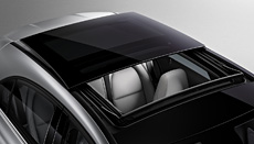 The panoramic sliding sunroof creates a transparent surface area twice the size of conventional sliding glass sunroofs and creates an interior with a particularly bright and friendly ambience. It consists of a fixed panoramic glass roof and an electrically operated glass sunroof which slides over the exterior of the roof. The transparent surface area is very large and lets in plenty of light. When the sunroof is opened using the switch, the wind deflector is first raised. Then the sunroof is raised upwards and slid backwards over the fixed glass roof section at the rear. In addition, there is a motorised sunblind.