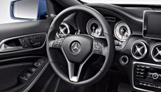 3-spoke multifunction steering wheel in nappa leather, with 12 function buttons, including shift/selector lever in nappa leather[9] The comfort multifunction steering wheel, which is covered in nappa leather, gives you comprehensive access to a variety of telematics and vehicle functions/settings. All the information relevant to the vehicle/journey is shown in the instrument cluster display. The multifunction steering wheel has 12 function buttons and an 11.4 cm display in the instrument cluster. The 3-spoke multifunction steering wheel with 12 function buttons and display in the instrument cluster is operated via two keypads on the steering wheel. The left-hand keypad is used to operate the menus, while the right-hand keypad controls the audio and telephone telematics functions. The "Settings" menu allows the driver to adjust various parameters, such as light and instrument cluster settings. Optional extras which are not fitted in the vehicle are skipped
