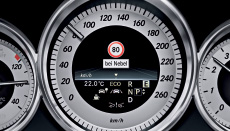 Using an integrated camera, the Speed Limit Assist system (available only in conjunction with Audio 50 APS or COMAND Online) can identify road signs and show the permitted maximum speed on the central display. This can reduce the danger of overlooking a speed limit, particularly on stretches of road with frequently changing traffic signs or along routes with road works. In order to verify the data retrieved via optical sensors and the following display, the system compares the values registered with the digital road maps of the navigation system.