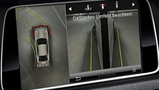 | | Parking package with 360-degree camera The Parking package helps the driver in tight parking and manoeuvring situations and comes with an innovation: A 360-degree camera system displays the vehicle's surroundings from a bird's-eye perspective on the screen of the COMAND Online multimedia system. Monitoring all four sides of the vehicle makes it easier to judge all manoeuvring situations. It can warn drivers visually and audibly of obstacles in front of and behind the vehicle, helping to prevent damage when manoeuvring.