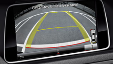 | | Reversing camera with dynamic guide lines in display The reversing camera offers convenience and added safety. Integrated into the boot lid, the camera transmits an image of the area behind the vehicle to the central COMAND Online multimedia system (optional extra). The camera image not only makes parking easier but also aids in manoeuvring on terrain with visibility restrictions.