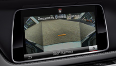 The 360-degree camera system displays the vehicle's surroundings from a bird's-eye perspective on the screen of the COMAND Online multimedia system. Monitoring all four sides of the vehicle makes it easier to judge all manoeuvring situations.