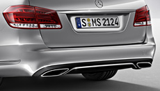 | | Exterior Sports package[3] Give your E-Class an even sportier look – with the optional Exterior Sports package. The lowered body, callipers on the front axle with Mercedes-Benz lettering and 5-twin-spoke alloy wheels lend your E-Class an exceptionally agile exterior appearance. The equipment of the Exterior Sports package at a glance: - Front brake callipers with Mercedes-Benz lettering
