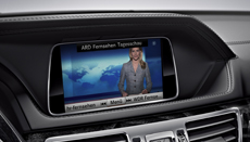 | | TV receiver for digital television reception, also giving access to multichannel sound, the electronic TV magazine EPG and video text The TV receiver enables television viewing during driving breaks: The receiver unit processes the digital signals in DVB-T standard and is controlled using the COMAND Online multimedia system, whose display is positioned in the driver’s central field of vision and also shows the image. Sound output is via the vehicle's speaker system. The receiving aerial is integrated in the rear window. At speeds above approx. 6 km/h, the image is switched off for safety reasons and reappears when the speed falls below this limit.