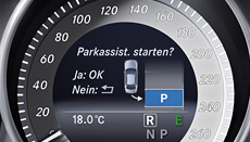 Active Parking Assist Active Parking Assist uses six ultrasonic sensors in the front bumper and six in the rear bumper to identify suitable parking spaces when the vehicle is travelling at speeds between 0 and 35 km/h. The automatic parking space search function is indicated by a "P" symbol in the instrument cluster. If Active Parking Assist has found a parking space, an arrow appears next to the "P". By default, Active Parking Assist searches for parking spaces on the right-hand side of the road. If the indicator on the driver's side is active, parking spaces on the left-hand side are also detected The driver starts the parking manoeuvring process by stopping ahead of the indicated parking space, selecting reverse and confirming the prompt which appears in the instrument cluster. Active Parking Assist steers up to a speed of 10 km/h. The driver only operates the accelerator and the brake pedal. The parking manoeuvre is completed in a maximum of 5 moves. The final parking move is indicated by the message "Parking Assist complete" in the display. This message is accompanied by an acoustic signal.< For the first time the E-Class furthermore offers the functions automatic parking and leaving a parking space with active steering and brake intervention as well as an additional lateral protection against obstacles located to the sides. PARKTRONIC: The system gives visible and audible signals to warn of obstacles it detects in front of the vehicle and behind. It is active up to a speed of about 18 km/h.