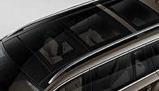 | | Brake callipers painted red[1] | | Chrome fins for the bonnet | | Diamond white metallic BRIGHT paint finish | | | | Minispare wheel in place of TIREFIT tyre sealant, including tyre-change tool kit | | Electrically adjustable panoramic sliding glass sunroof, with comfort and automatic rain-closing functions, PRE-SAFE® closing and electric roller sunblind The panoramic sliding sunroof creates a transparent surface area twice the size of conventional sliding glass sunroofs and creates an interior with a particularly bright and friendly ambience. It consists of a fixed panoramic glass sunroof above the second and third seat rows and an electrically-operated sliding glass roof and allows very good visibility thanks to its above-average sized glass area.When the sunroof is opened using the switch, the wind deflector is raised. Then the sunroof is raised upwards and slides back over the fixed glass roof section at the rear. In addition there are two electrically-powered sunblinds in the centrepiece, which can be simultaneously rolled out in both directions. An additional, removable sunshade is positioned above the third seat row and provides protection against penetrating sun rays. An electrically operated vent window also forms part of the fittings for the third seat row.
